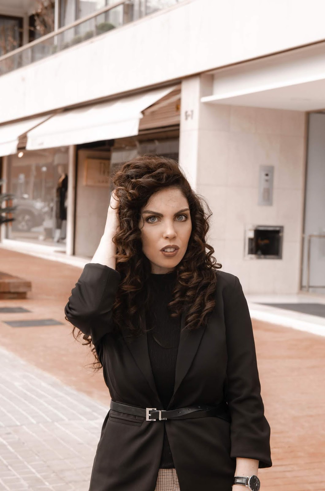 En el look que os propongo hoy he apostado por una combinación de pantalón de corte masculino, jersey negro de cuello Perkins y americana básica negra con cinturón, un truco para conseguir una figura más estilizada, y verse más delgada. En principio, con esta descripción parece un estilo bastante sobrio y formal, pero decidí darle un toque rompedor con botas militares con cordones de media caña, y sin duda es la clave para transformar el outfit, aportar frescura y marcar estilazo.